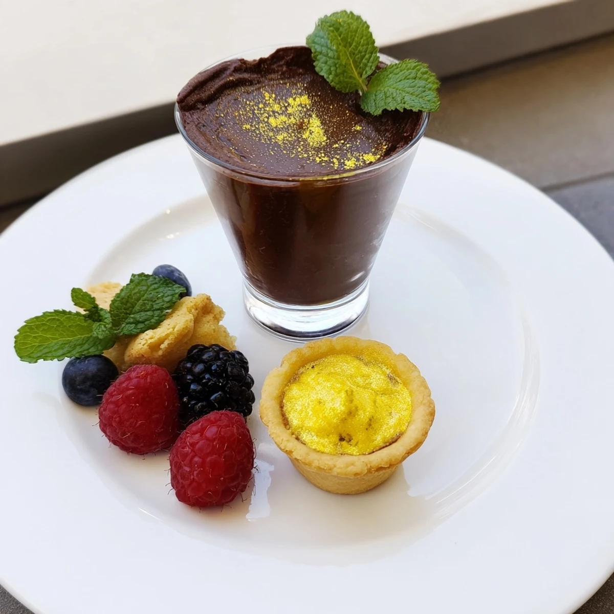 Edible gold dust or glitter, fresh mint leaves, and mixed berries add spark and vibrance to the dessert plate.