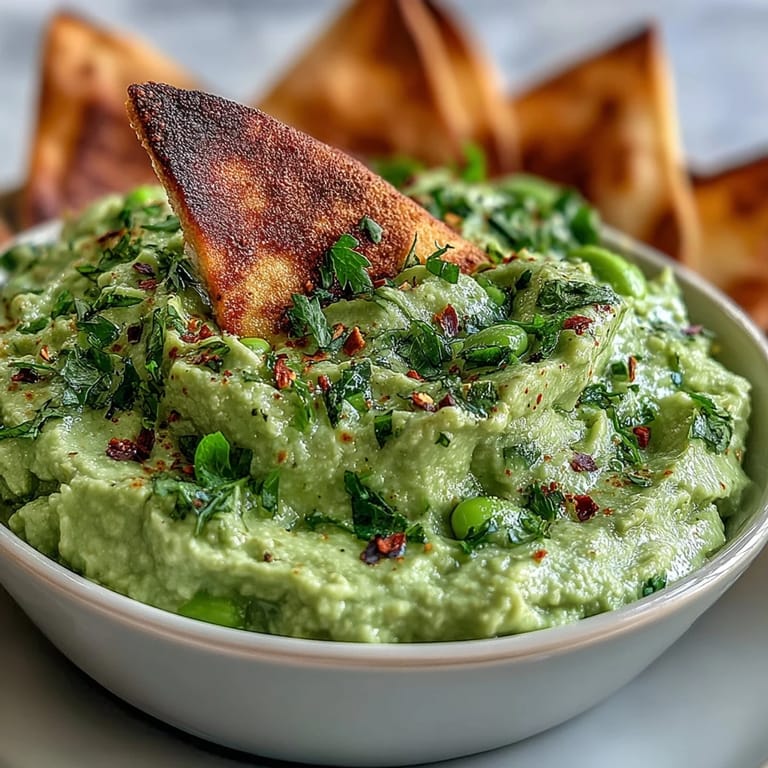 This Edamame Guacamole with Pita Chips shines as both a casual snack and an elegant appetizer. Serve it as part of a mezze platter alongside hummus, baba ganoush, olives, and feta cheese for a Mediterranean-inspired spread. It's perfect for game day gatherings, potlucks, or movie nights at home. For entertaining, present the guacamole in a beautiful serving bowl garnished with extra cilantro leaves, a lime wedge, and a drizzle of olive oil. Store leftover guacamole in an airtight container with plastic wrap pressed directly onto the surface to minimize browning, though it's best enjoyed fresh.