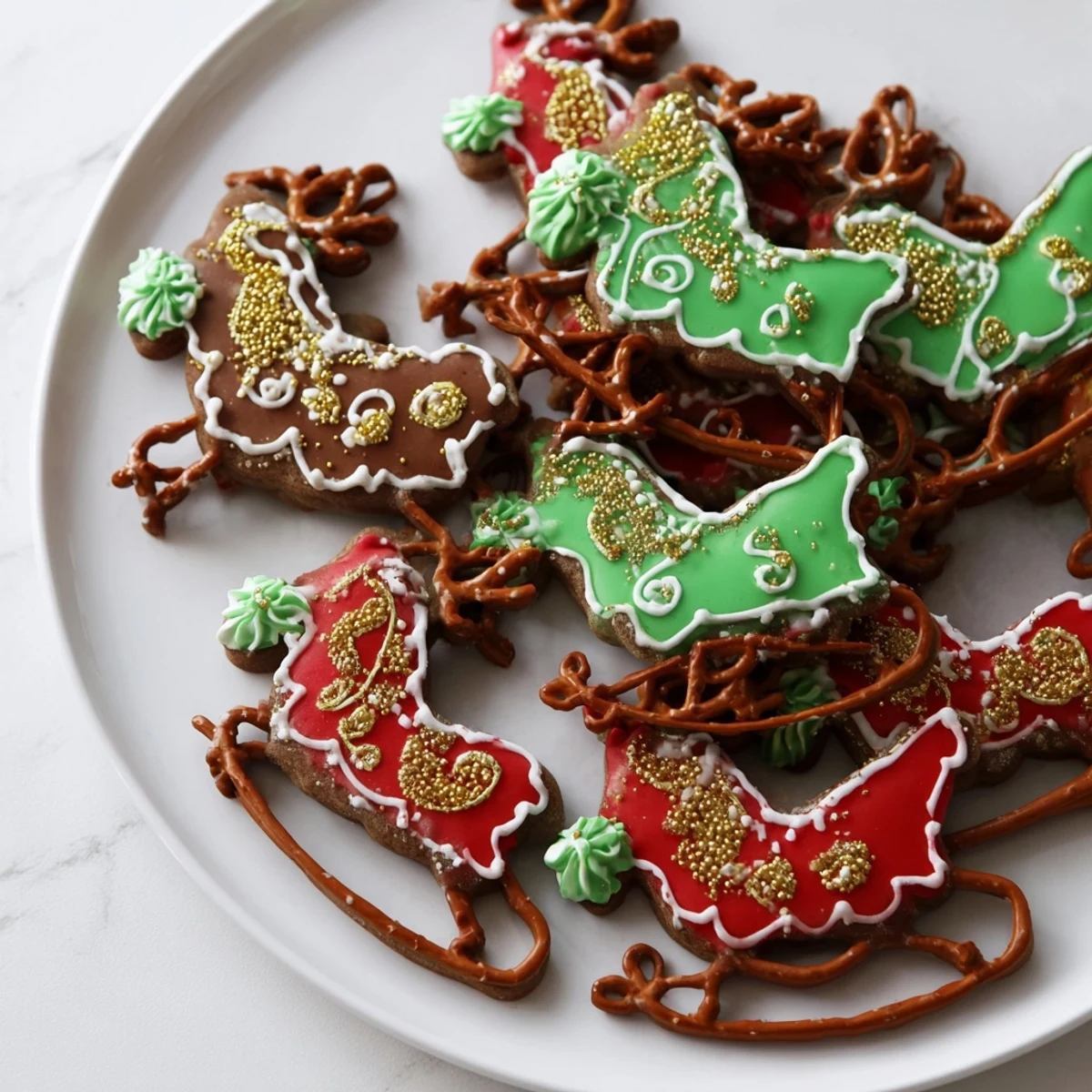 - For the display, arrange sleigh cookies at the center of a platter. Place reindeer in front, connecting with icing or edible glue. Fill sleigh with tree star cookies or mini candies. Use mini pretzels or candy canes as sleigh runners, attaching with icing if desired.