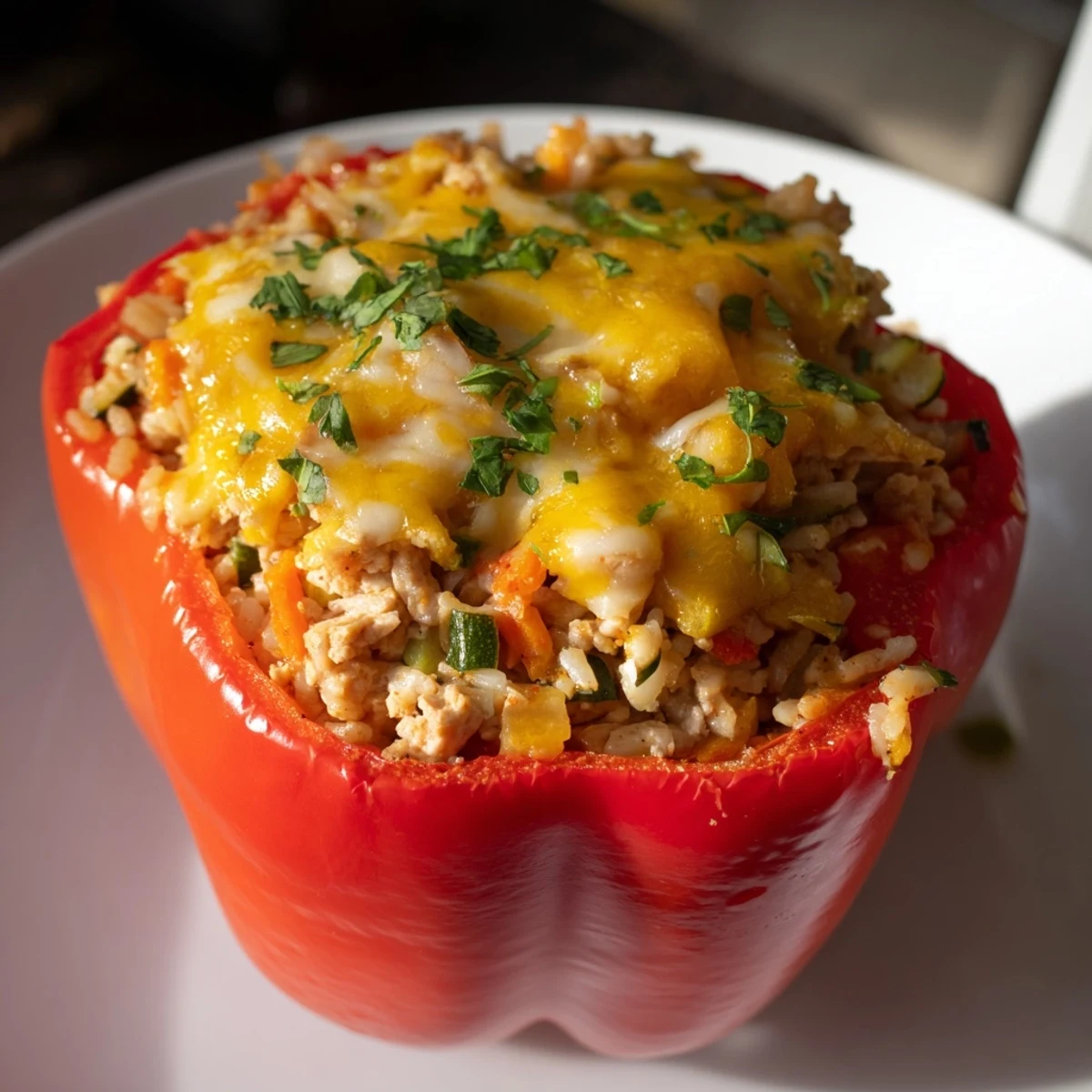 Save Colorful bell peppers filled with savory ground turkey, fluffy rice, and vegetables, baked to perfection for a hearty and wholesome dinner.