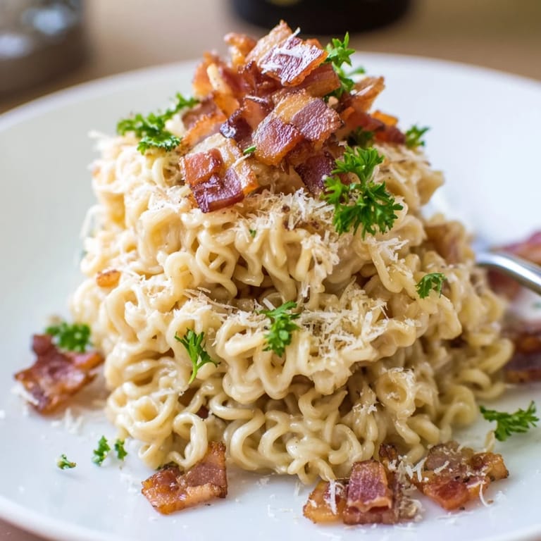 Save A quick, creamy fusion dish blending Italian carbonara with the bold flavors and convenience of ramen noodles Perfect for a satisfying meal in minutes!
