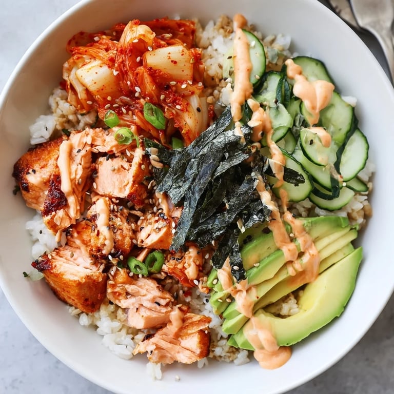 Save A vibrant, flavor-packed bowl featuring crispy salmon, fluffy rice, spicy mayo, tangy kimchi, and savory garlic for a perfect balance of textures and tastes.